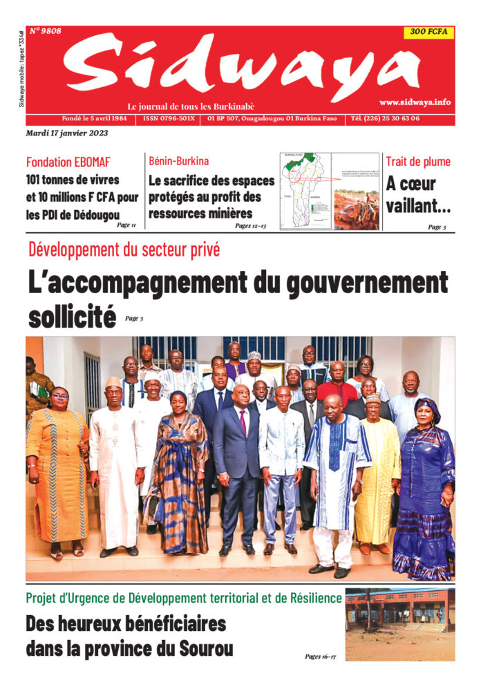 SIDWAYA QUOTIDIEN Une du 17/01/2023 Par JK. Sidwaya - 16 janvier 2023 FacebookTwitterPinterestWhatsAppLinkedinE-mailImprimerTumblrTelegramViberNaver