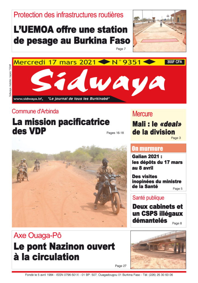 SIDWAYA QUOTIDIEN Une du 17-03-2021 Par BM. Sidwaya - 16 mars 2021 FacebookTwitterPinterestWhatsAppLinkedinE-mailImprimerTumblrTelegramViberNaver