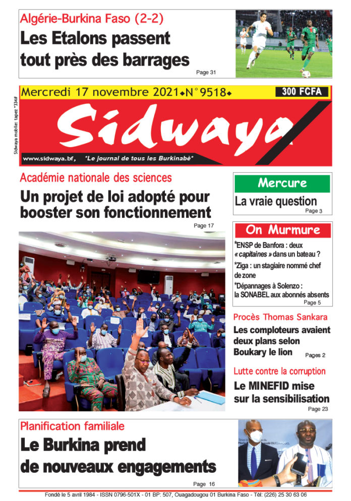 SIDWAYA QUOTIDIEN Une du 17/11/2021 Par JK. Sidwaya - 16 novembre 2021 FacebookTwitterPinterestWhatsAppLinkedinE-mailImprimerTumblrTelegramViberNaver