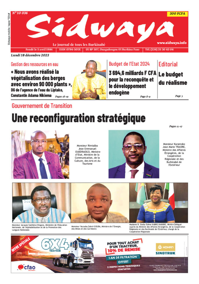 SIDWAYA QUOTIDIEN Une du 18-12-2023 Par JK. Sidwaya - 18 décembre 2023 FacebookTwitterPinterestWhatsAppLinkedinE-mailImprimerTumblrTelegramViberNaver