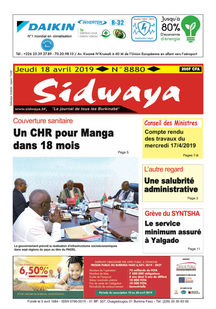 SIDWAYA SPORT Une du 18 avril 2019 Par JK. Sidwaya - 18 avril 2019 FacebookTwitterPinterestWhatsAppLinkedinE-mailImprimerTumblrTelegramViberNaver