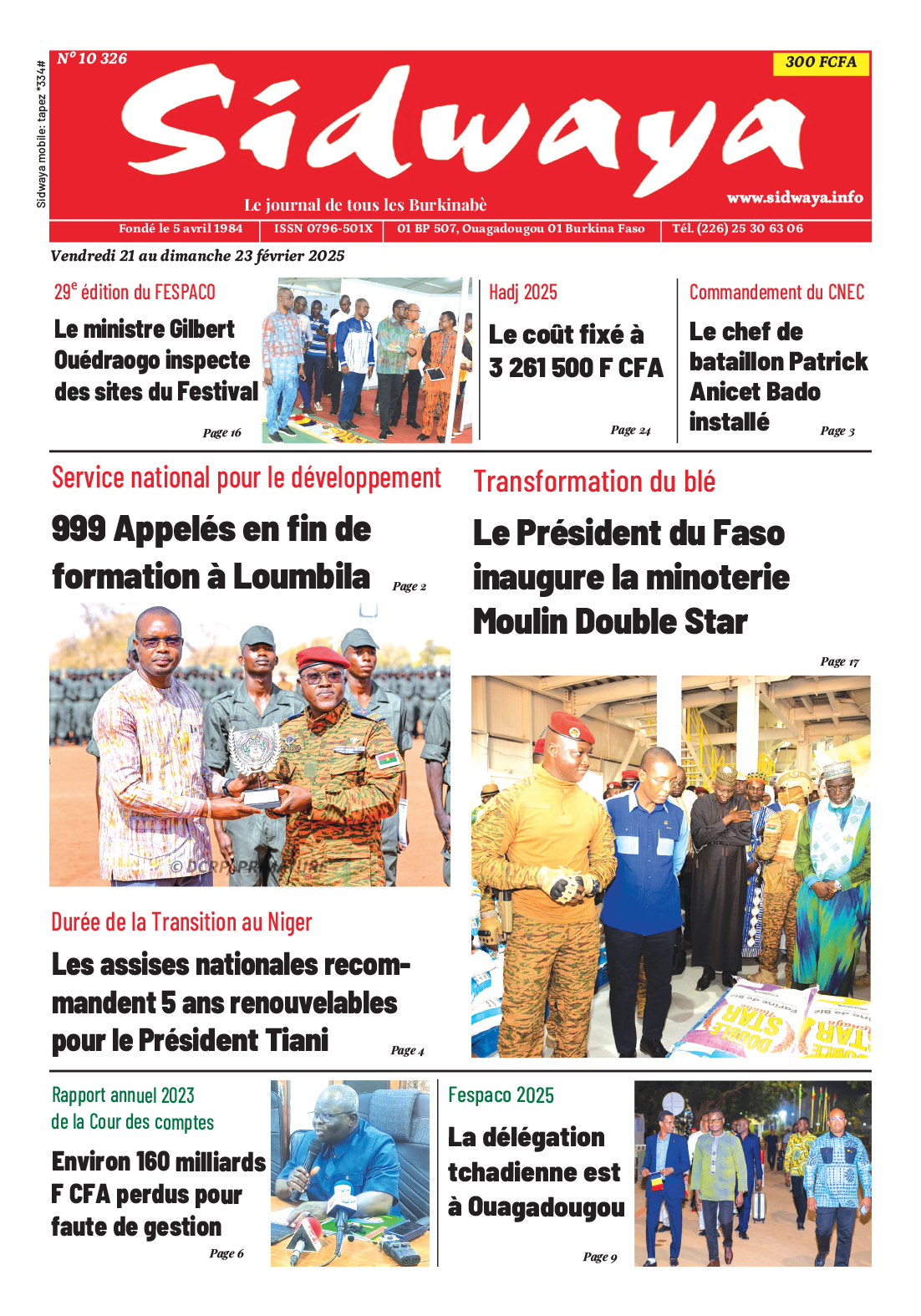 SIDWAYA QUOTIDIEN Une du 21-02-2025 Par JK. Sidwaya - 20 février 2025 FacebookTwitterPinterestWhatsAppLinkedinE-mailImprimerTumblrTelegramViberNaver