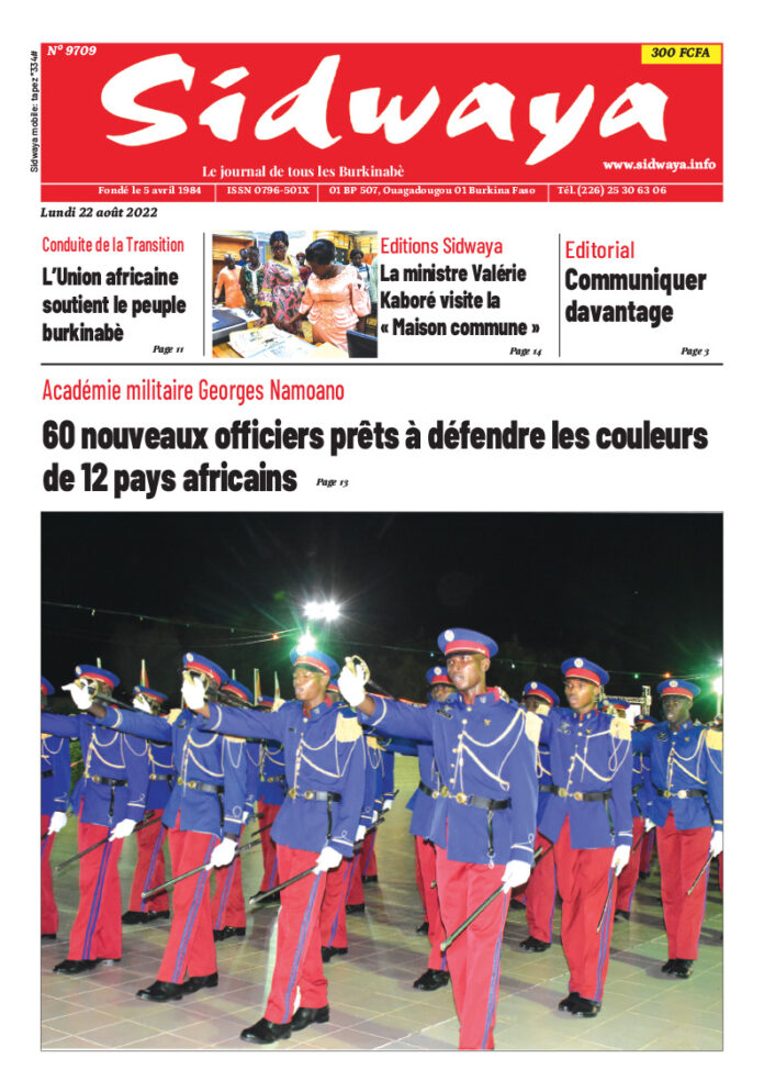 SIDWAYA QUOTIDIEN Une du 22/08/2022 Par JK. Sidwaya - 21 août 2022 FacebookTwitterPinterestWhatsAppLinkedinE-mailImprimerTumblrTelegramViberNaver