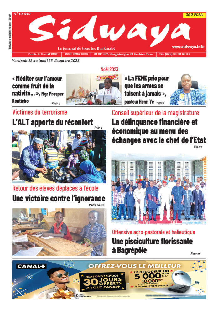 SIDWAYA QUOTIDIEN Une du 22-12-2023 Par JK. Sidwaya - 21 décembre 2023 FacebookTwitterPinterestWhatsAppLinkedinE-mailImprimerTumblrTelegramViberNaver