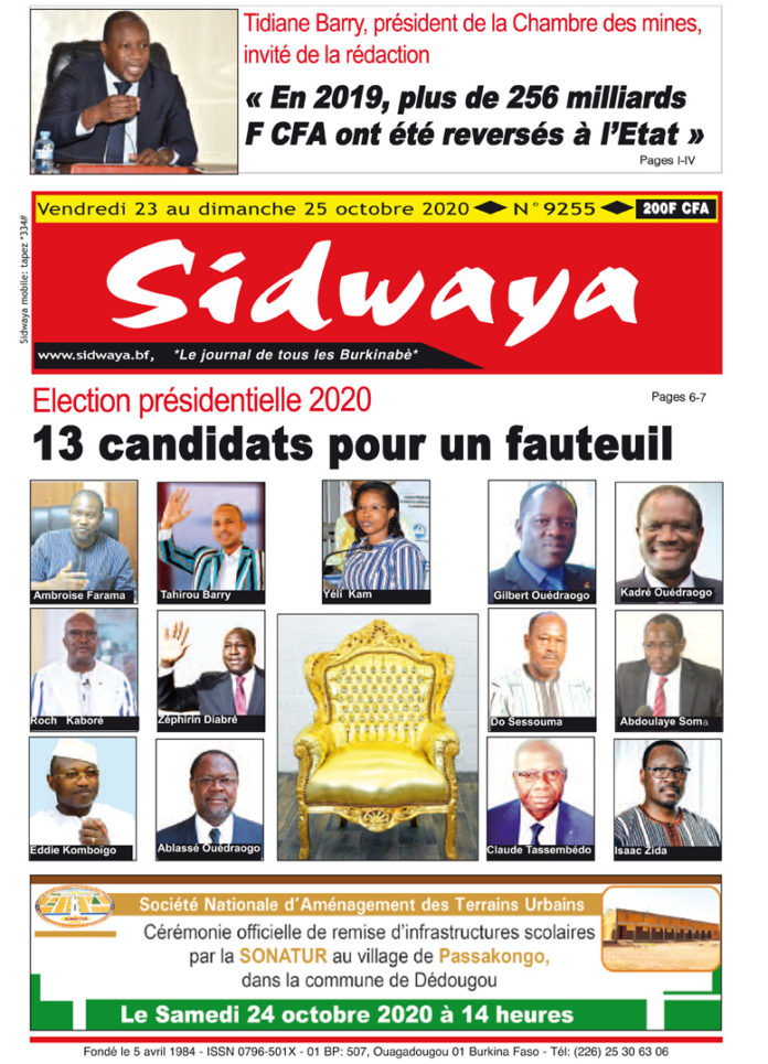 SIDWAYA QUOTIDIEN Une du 23-10-2020 Par BM. Sidwaya - 22 octobre 2020 FacebookTwitterPinterestWhatsAppLinkedinE-mailImprimerTumblrTelegramViberNaver