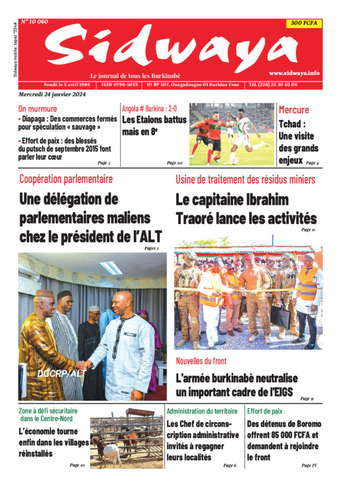 SIDWAYA QUOTIDIEN Une du 24-01-2024 Par JK. Sidwaya - 24 janvier 2024 FacebookTwitterPinterestWhatsAppLinkedinE-mailImprimerTumblrTelegramViberNaver