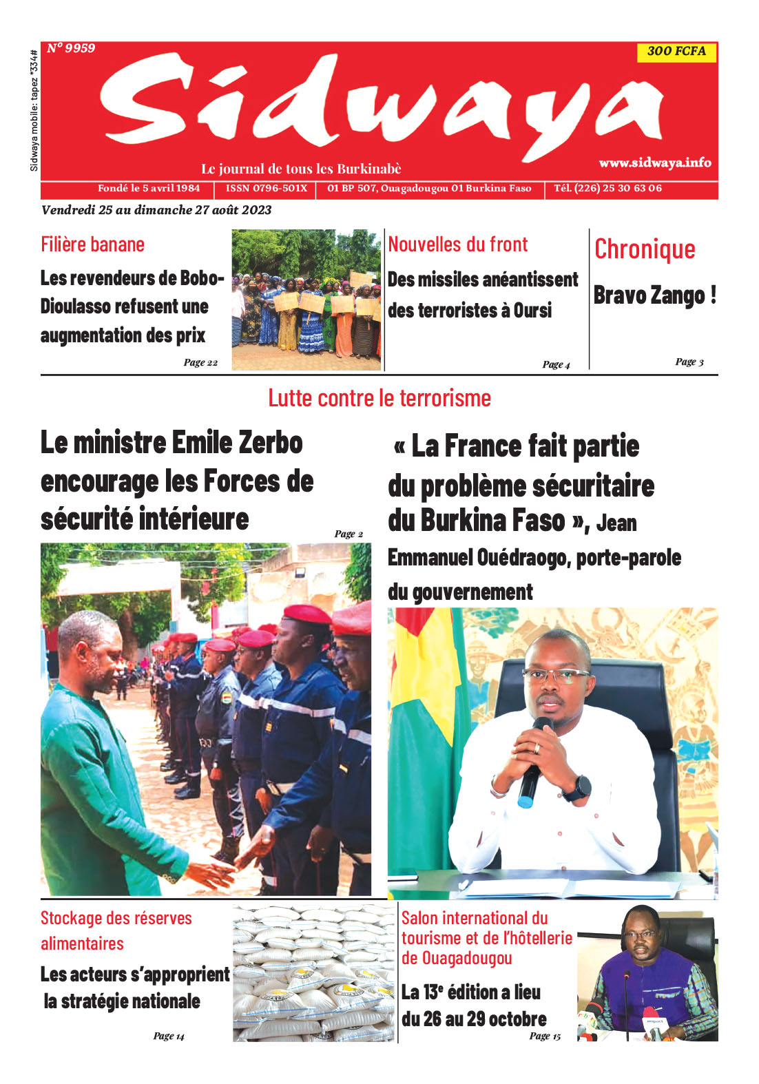SIDWAYA QUOTIDIEN Une du 25-08-2023 Par JK. Sidwaya - 24 août 2023 FacebookTwitterPinterestWhatsAppLinkedinE-mailImprimerTumblrTelegramViberNaver