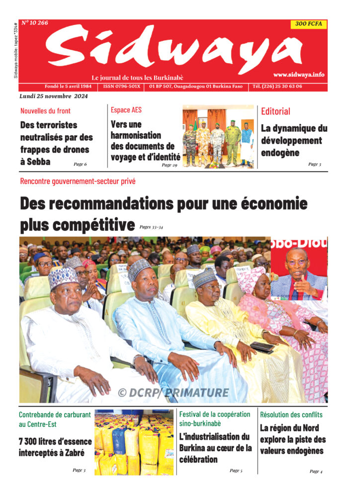 SIDWAYA QUOTIDIEN Une du 25-11-2024 Par JK. Sidwaya - 24 novembre 2024 FacebookTwitterPinterestWhatsAppLinkedinE-mailImprimerTumblrTelegramViberNaver