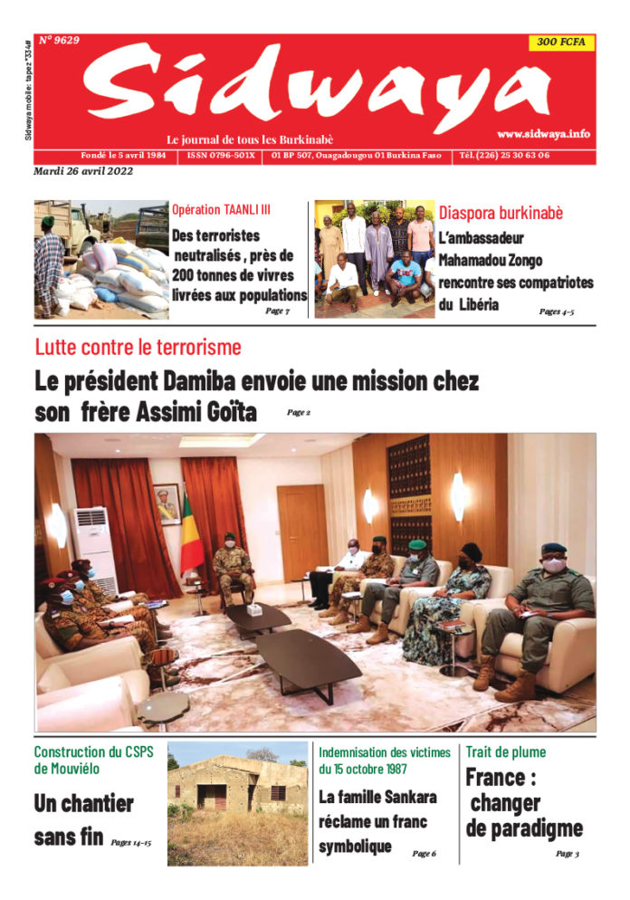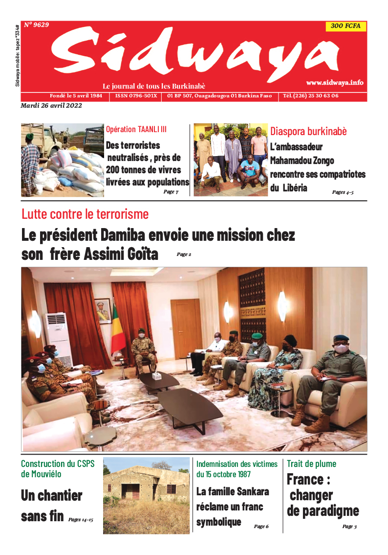 SIDWAYA QUOTIDIEN Une du 26/04/2022 Par JK. Sidwaya - 25 avril 2022 FacebookTwitterPinterestWhatsAppLinkedinE-mailImprimerTumblrTelegramViberNaver
