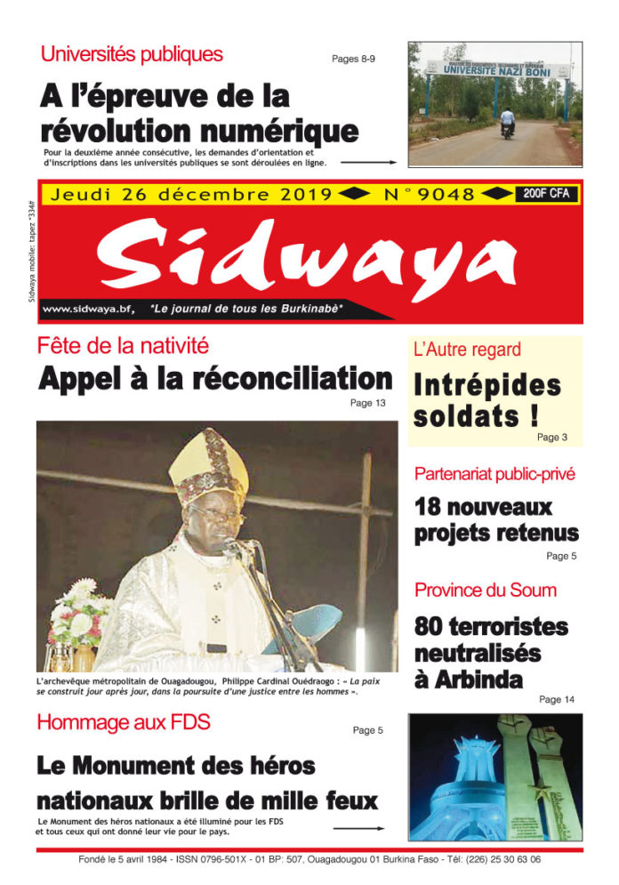 SIDWAYA QUOTIDIEN Une du 26-12-2019 Par DD. Sidwaya - 25 décembre 2019 FacebookTwitterPinterestWhatsAppLinkedinE-mailImprimerTumblrTelegramViberNaver