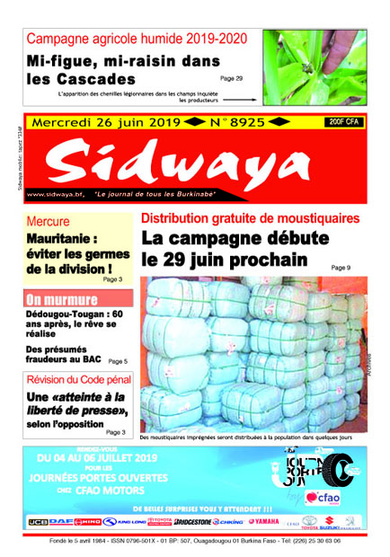 SIDWAYA QUOTIDIEN Une du 26 juin 2019 Par DD. Sidwaya - 25 juin 2019 FacebookTwitterPinterestWhatsAppLinkedinE-mailImprimerTumblrTelegramViberNaver
