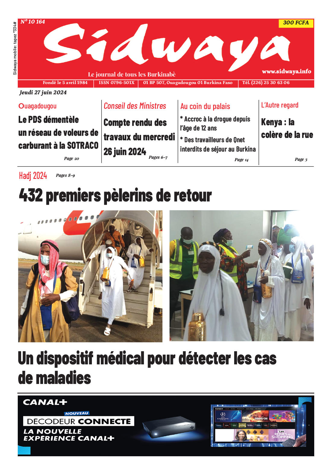 SIDWAYA QUOTIDIEN Une du 27-6-2024 Par JK. Sidwaya - 26 juin 2024 FacebookTwitterPinterestWhatsAppLinkedinE-mailImprimerTumblrTelegramViberNaver