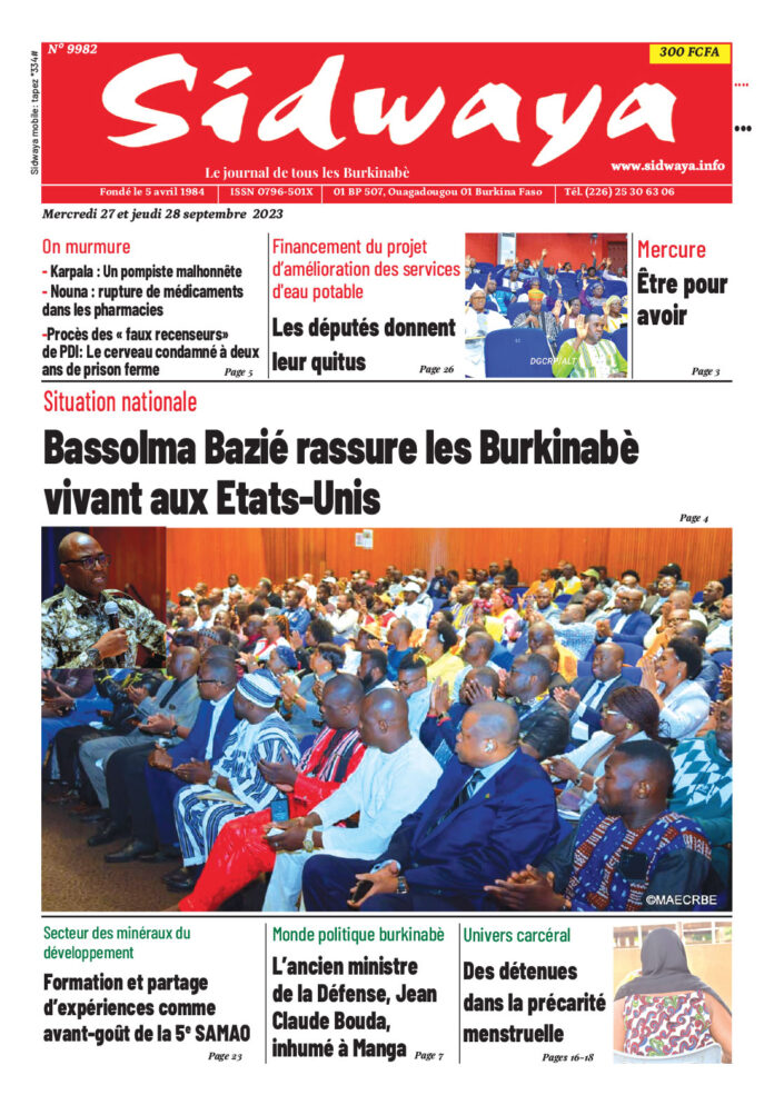 SIDWAYA QUOTIDIEN Une du 27-9-2023 Par JK. Sidwaya - 26 septembre 2023 FacebookTwitterPinterestWhatsAppLinkedinE-mailImprimerTumblrTelegramViberNaver
