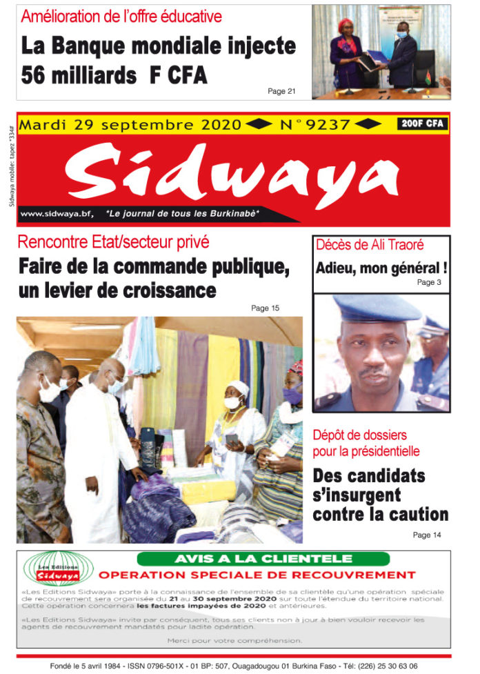 SIDWAYA QUOTIDIEN Une du 29-09-2020 Par BM. Sidwaya - 28 septembre 2020 FacebookTwitterPinterestWhatsAppLinkedinE-mailImprimerTumblrTelegramViberNaver