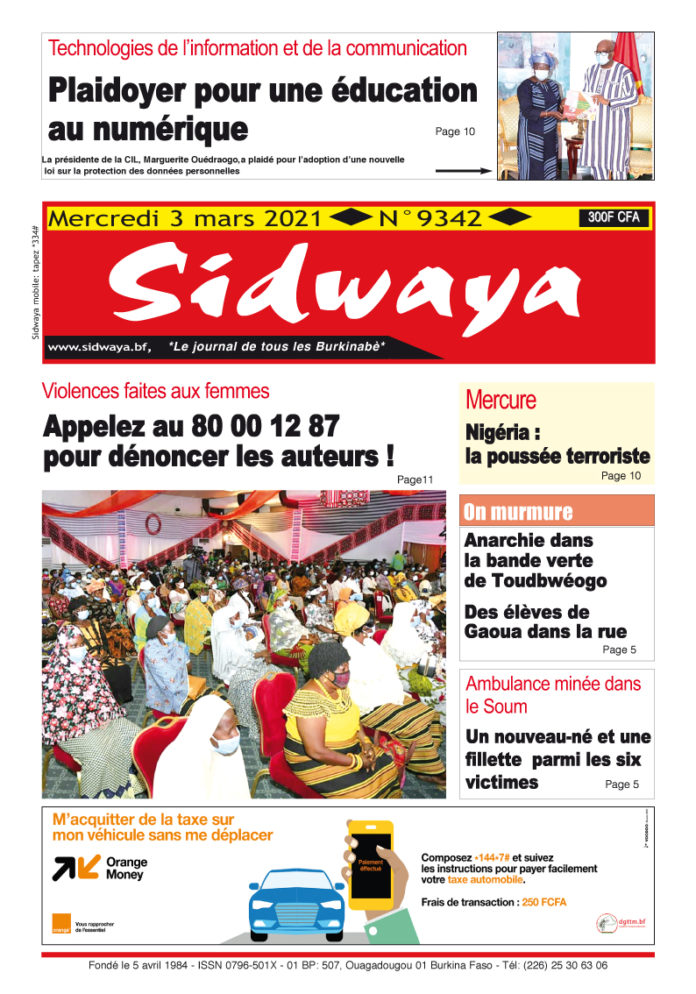 SIDWAYA QUOTIDIEN Une du 3-3-2021 Par BM. Sidwaya - 2 mars 2021 FacebookTwitterPinterestWhatsAppLinkedinE-mailImprimerTumblrTelegramViberNaver