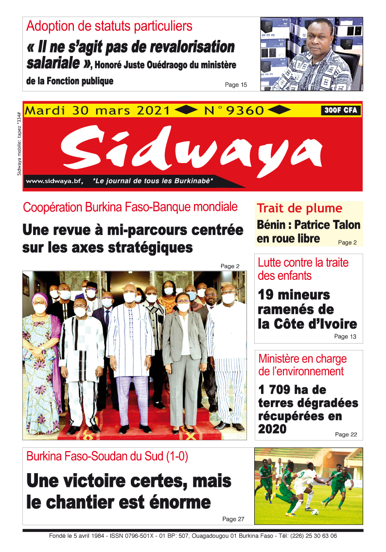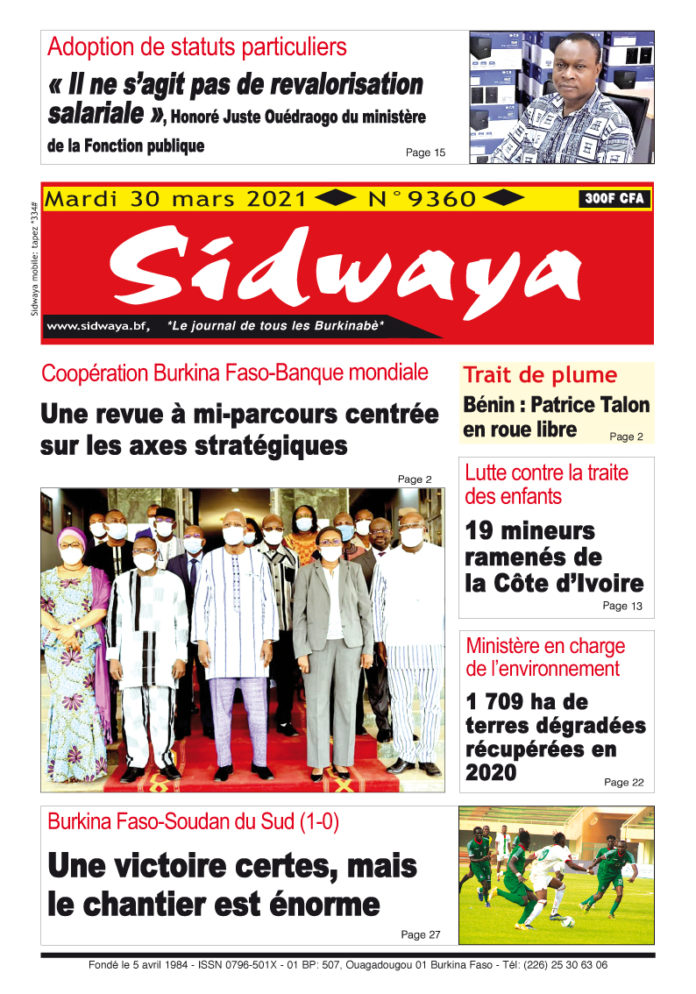 SIDWAYA QUOTIDIEN Une du 30-03-2021 Par BM. Sidwaya - 29 mars 2021 FacebookTwitterPinterestWhatsAppLinkedinE-mailImprimerTumblrTelegramViberNaver
