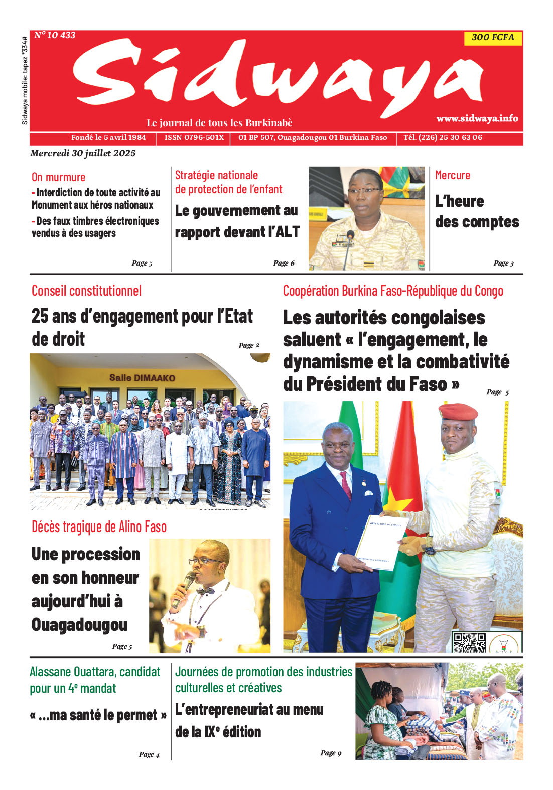 SIDWAYA QUOTIDIEN Une du 30-07-2025 Par JK. Sidwaya - 29 juillet 2025 FacebookTwitterPinterestWhatsAppLinkedinE-mailImprimerTumblrTelegramViberNaver