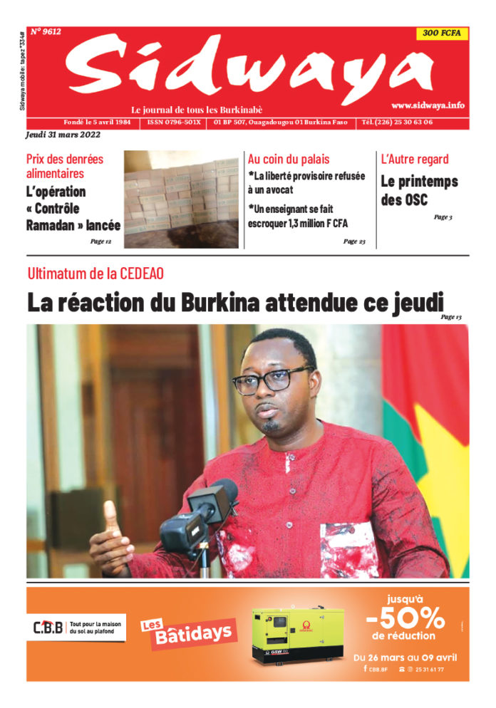 SIDWAYA QUOTIDIEN Une du 31/03/2022 Par JK. Sidwaya - 30 mars 2022 FacebookTwitterPinterestWhatsAppLinkedinE-mailImprimerTumblrTelegramViberNaver