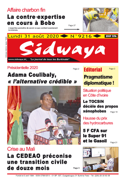 SIDWAYA QUOTIDIEN Une du 31-08-2020 Par BM. Sidwaya - 30 août 2020 FacebookTwitterPinterestWhatsAppLinkedinE-mailImprimerTumblrTelegramViberNaver