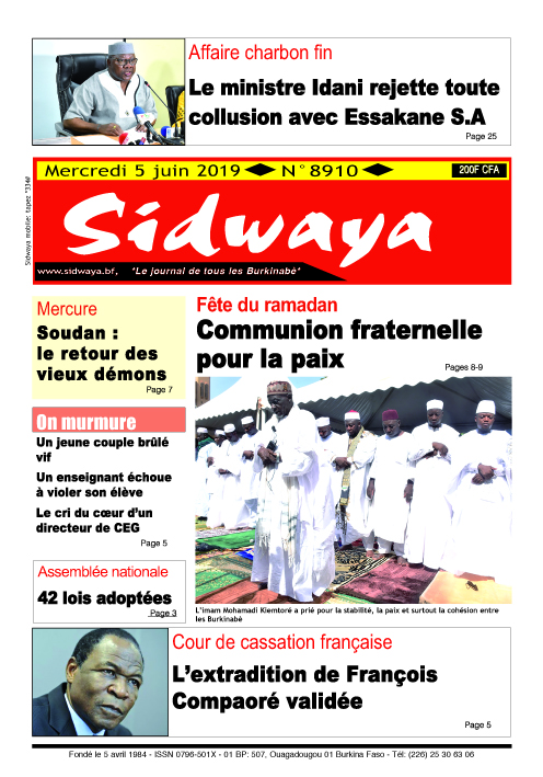 SIDWAYA QUOTIDIEN Une du 5 juin 2019 Par DD. Sidwaya - 4 juin 2019 FacebookTwitterPinterestWhatsAppLinkedinE-mailImprimerTumblrTelegramViberNaver