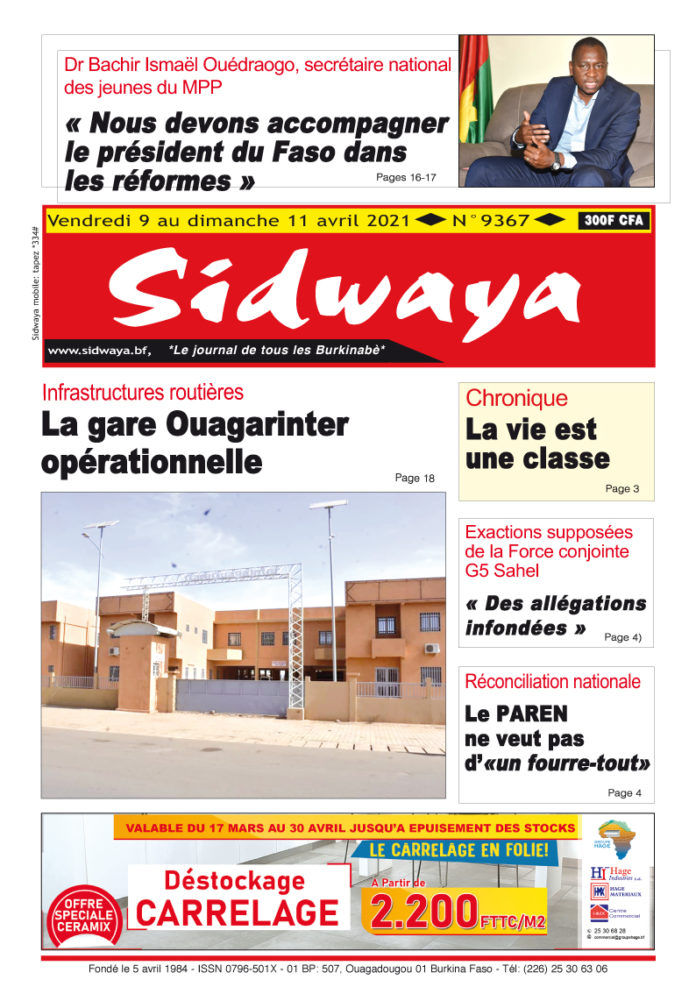 SIDWAYA QUOTIDIEN Une du 9-04-2021 Par BM. Sidwaya - 8 avril 2021 FacebookTwitterPinterestWhatsAppLinkedinE-mailImprimerTumblrTelegramViberNaver
