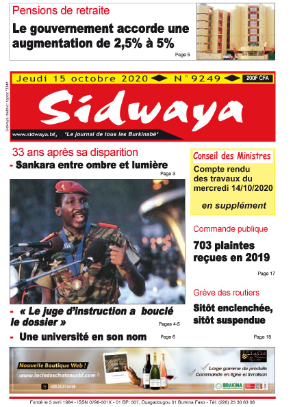 SIDWAYA QUOTIDIEN Une du15-10-2020 Par BM. Sidwaya - 14 octobre 2020 FacebookTwitterPinterestWhatsAppLinkedinE-mailImprimerTumblrTelegramViberNaver