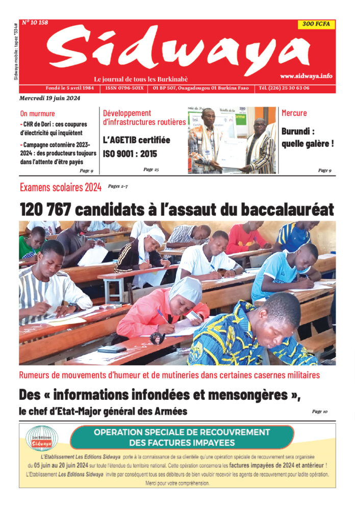 SIDWAYA QUOTIDIEN Une sidwaya 19-06-2024 Par JK. Sidwaya - 18 juin 2024 FacebookTwitterPinterestWhatsAppLinkedinE-mailImprimerTumblrTelegramViberNaver