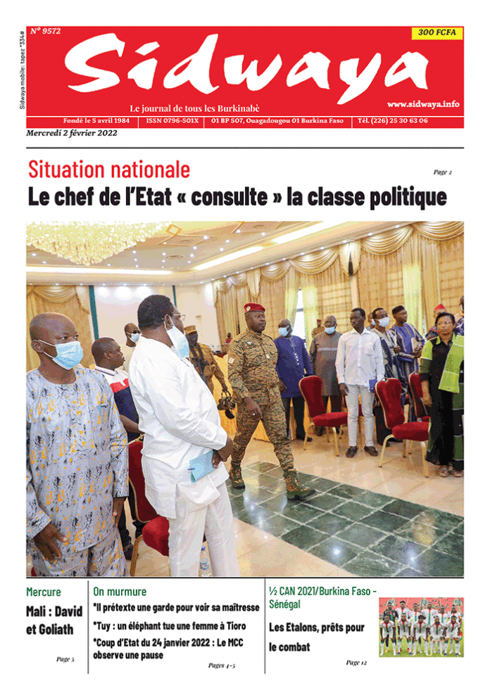 SIDWAYA QUOTIDIEN Une Sidwaya du 02-02-2022 Par JK. Sidwaya - 1 février 2022 FacebookTwitterPinterestWhatsAppLinkedinE-mailImprimerTumblrTelegramViberNaver