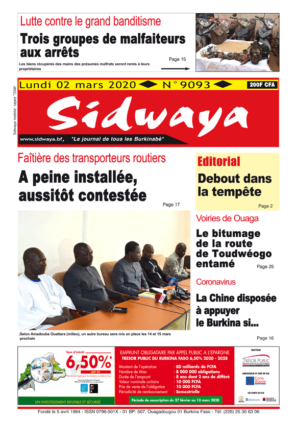 SIDWAYA QUOTIDIEN Une sidwaya du 02 03 2020 Par BM. Sidwaya - 2 mars 2020 FacebookTwitterPinterestWhatsAppLinkedinE-mailImprimerTumblrTelegramViberNaver