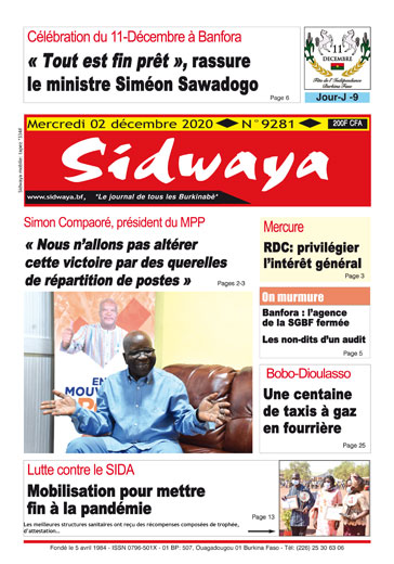 SIDWAYA QUOTIDIEN Une sidwaya du 02 12 2020 Par BM. Sidwaya - 1 décembre 2020 FacebookTwitterPinterestWhatsAppLinkedinE-mailImprimerTumblrTelegramViberNaver