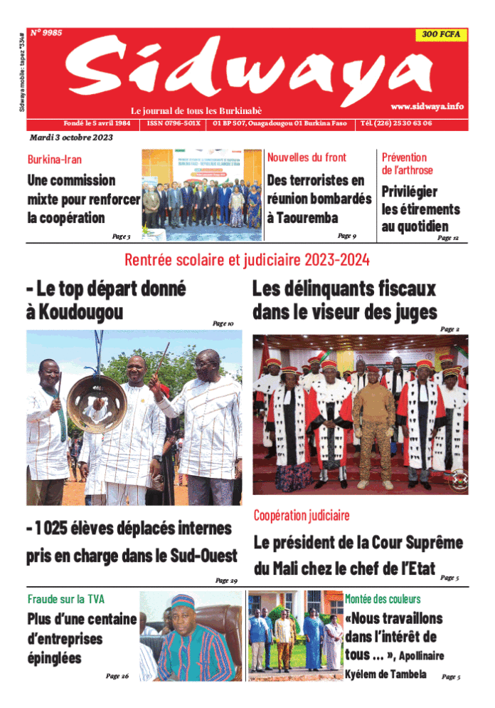 SIDWAYA QUOTIDIEN Une Sidwaya du 03-10-2023 Par JK. Sidwaya - 3 octobre 2023 FacebookTwitterPinterestWhatsAppLinkedinE-mailImprimerTumblrTelegramViberNaver
