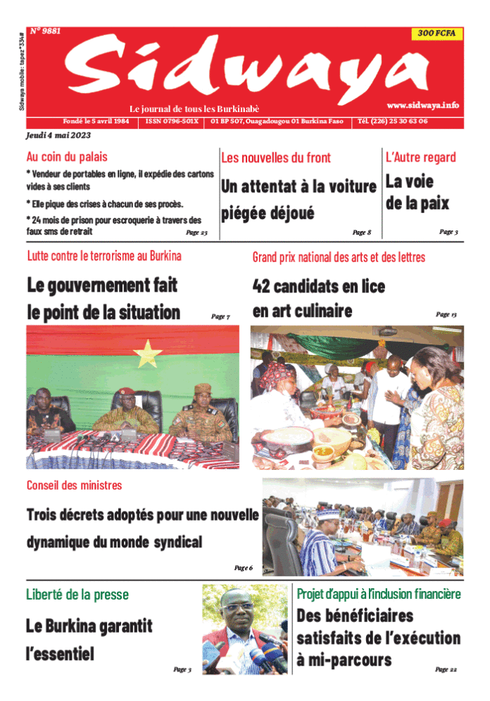 SIDWAYA QUOTIDIEN Une Sidwaya du 04-05-2023 Par JK. Sidwaya - 3 mai 2023 FacebookTwitterPinterestWhatsAppLinkedinE-mailImprimerTumblrTelegramViberNaver