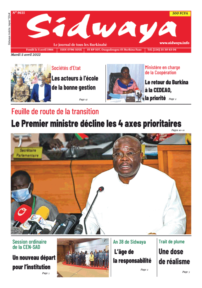SIDWAYA QUOTIDIEN Une Sidwaya du 05-04-2022 Par JK. Sidwaya - 4 avril 2022 FacebookTwitterPinterestWhatsAppLinkedinE-mailImprimerTumblrTelegramViberNaver
