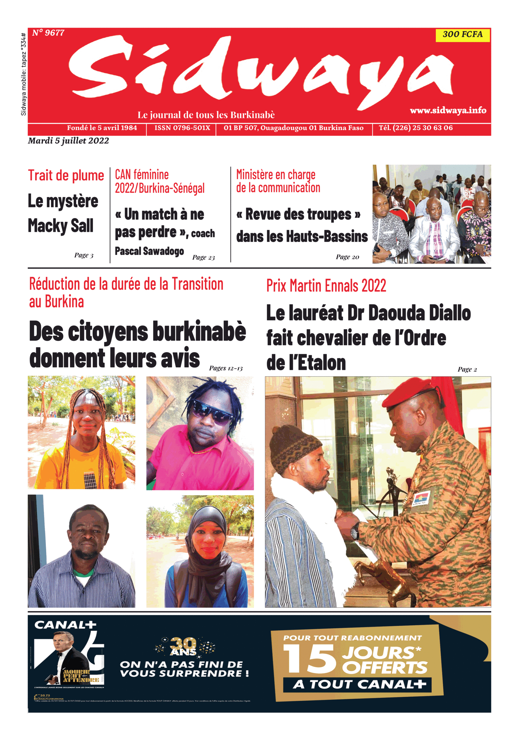 SIDWAYA QUOTIDIEN Une Sidwaya du 05-07-2022 Par JK. Sidwaya - 5 juillet 2022 FacebookTwitterPinterestWhatsAppLinkedinE-mailImprimerTumblrTelegramViberNaver