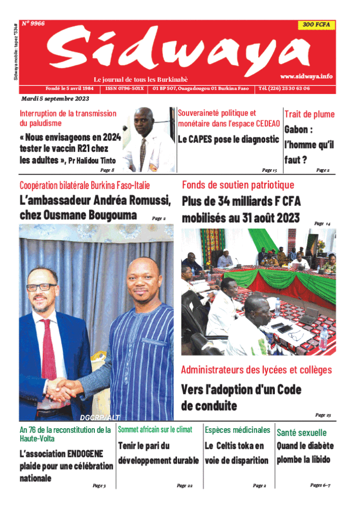 SIDWAYA QUOTIDIEN Une Sidwaya du 05-09-2023 Par JK. Sidwaya - 4 septembre 2023 FacebookTwitterPinterestWhatsAppLinkedinE-mailImprimerTumblrTelegramViberNaver