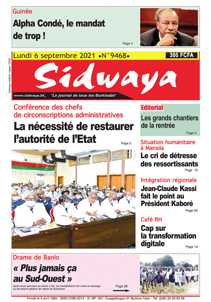SIDWAYA QUOTIDIEN Une sidwaya du 06-09-2021 Par JK. Sidwaya - 5 septembre 2021 FacebookTwitterPinterestWhatsAppLinkedinE-mailImprimerTumblrTelegramViberNaver