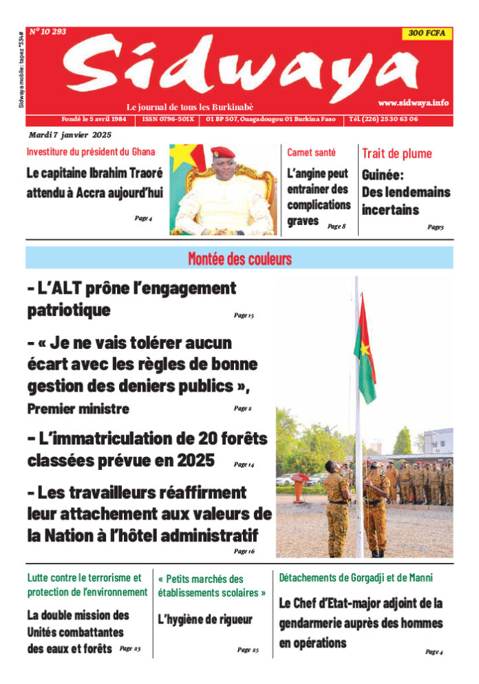 SIDWAYA QUOTIDIEN Une Sidwaya du 07-01-2025 Par JK. Sidwaya - 7 janvier 2025 FacebookTwitterPinterestWhatsAppLinkedinE-mailImprimerTumblrTelegramViberNaver