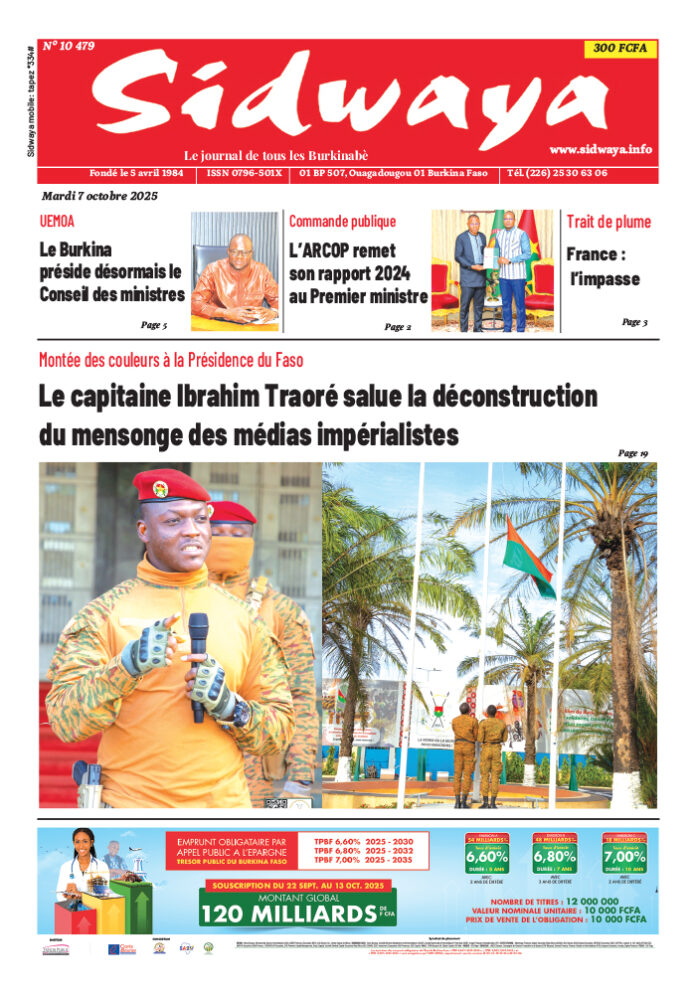 SIDWAYA QUOTIDIEN Une Sidwaya du 07-10-2025 Par JK. Sidwaya - 7 octobre 2025 FacebookTwitterPinterestWhatsAppLinkedinE-mailImprimerTumblrTelegramViberNaver