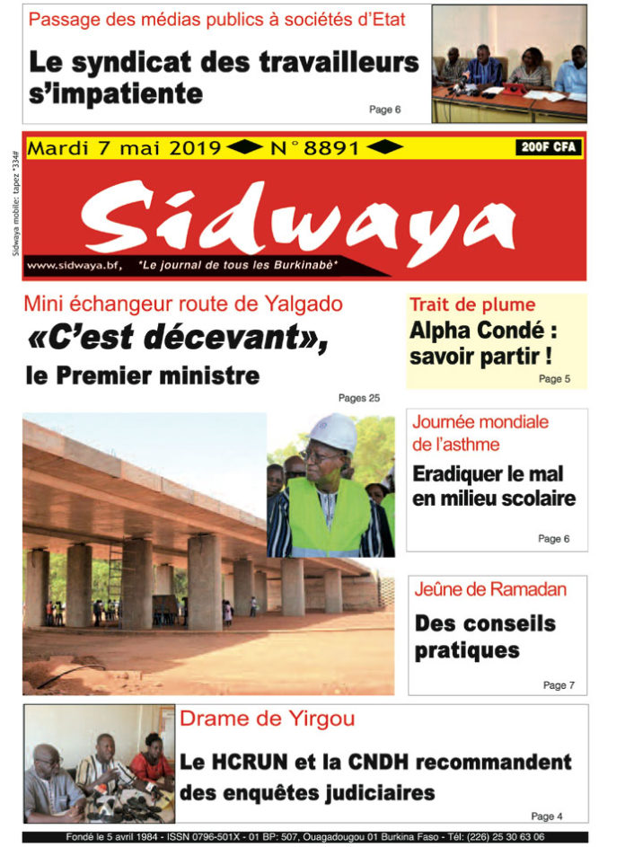 SIDWAYA QUOTIDIEN Une Sidwaya du 07 mai 2019 Par JK. Sidwaya - 6 mai 2019 FacebookTwitterPinterestWhatsAppLinkedinE-mailImprimerTumblrTelegramViberNaver