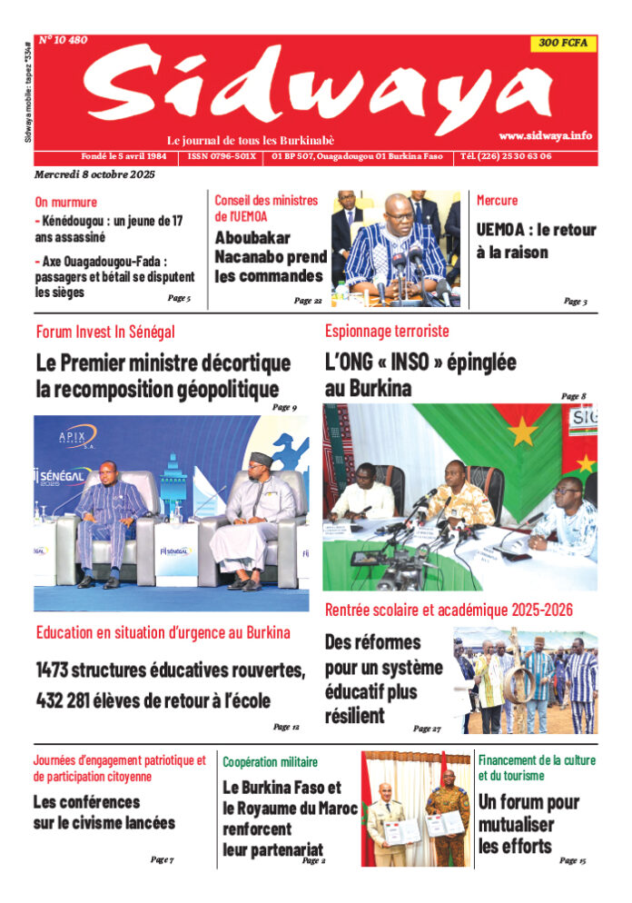 SIDWAYA QUOTIDIEN Une Sidwaya du 08-10-2025 Par JK. Sidwaya - 8 octobre 2025 FacebookTwitterPinterestWhatsAppLinkedinE-mailImprimerTumblrTelegramViberNaver