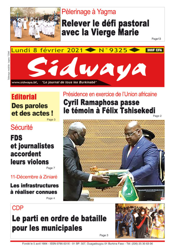 SIDWAYA QUOTIDIEN Une Sidwaya du 08 février 2021 Par JK. Sidwaya - 7 février 2021 FacebookTwitterPinterestWhatsAppLinkedinE-mailImprimerTumblrTelegramViberNaver