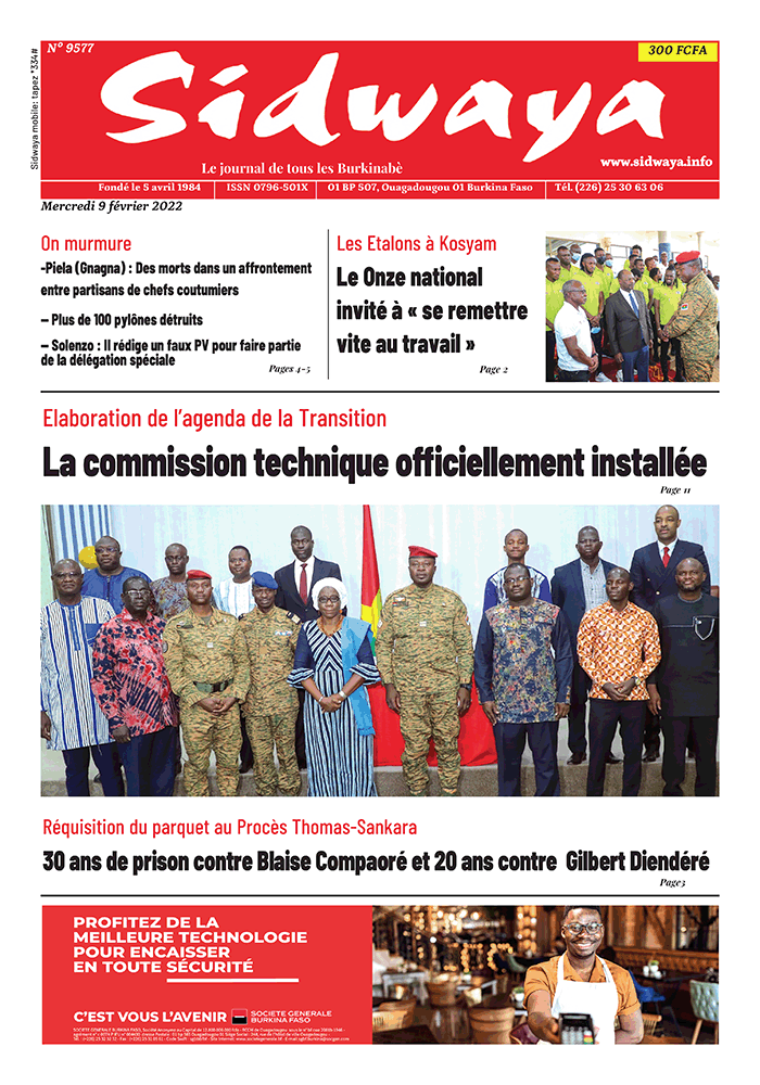 SIDWAYA QUOTIDIEN Une Sidwaya du 09-02-2022 Par JK. Sidwaya - 9 février 2022 FacebookTwitterPinterestWhatsAppLinkedinE-mailImprimerTumblrTelegramViberNaver