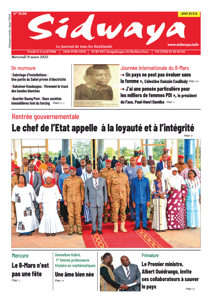 SIDWAYA QUOTIDIEN Une Sidwaya du 09-03-2022 Par JK. Sidwaya - 8 mars 2022 FacebookTwitterPinterestWhatsAppLinkedinE-mailImprimerTumblrTelegramViberNaver