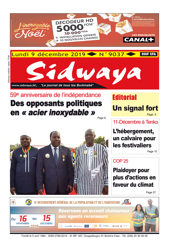 SIDWAYA QUOTIDIEN Une Sidwaya du 09 12 2019 Par BM. Sidwaya - 8 décembre 2019 FacebookTwitterPinterestWhatsAppLinkedinE-mailImprimerTumblrTelegramViberNaver