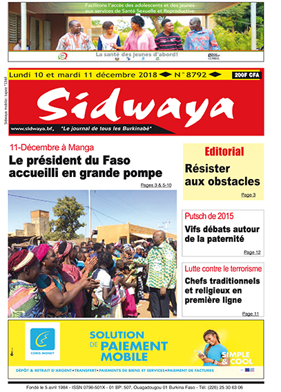 SIDWAYA QUOTIDIEN Une Sidwaya du 10 dec.2018 Par JK. Sidwaya - 10 décembre 2018 FacebookTwitterPinterestWhatsAppLinkedinE-mailImprimerTumblrTelegramViberNaver