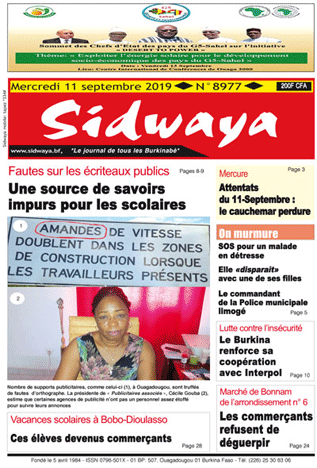 SIDWAYA QUOTIDIEN Une sidwaya du 11 09 2019 Par JK. Sidwaya - 11 septembre 2019 FacebookTwitterPinterestWhatsAppLinkedinE-mailImprimerTumblrTelegramViberNaver