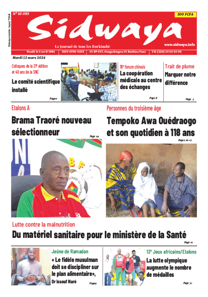 SIDWAYA QUOTIDIEN Une Sidwaya du 12-03-2024 Par JK. Sidwaya - 12 mars 2024 FacebookTwitterPinterestWhatsAppLinkedinE-mailImprimerTumblrTelegramViberNaver