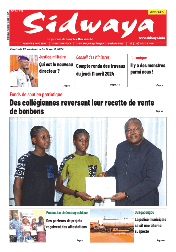 SIDWAYA QUOTIDIEN Une Sidwaya du 12 au 14-04-2024 Par JK. Sidwaya - 11 avril 2024 FacebookTwitterPinterestWhatsAppLinkedinE-mailImprimerTumblrTelegramViberNaver