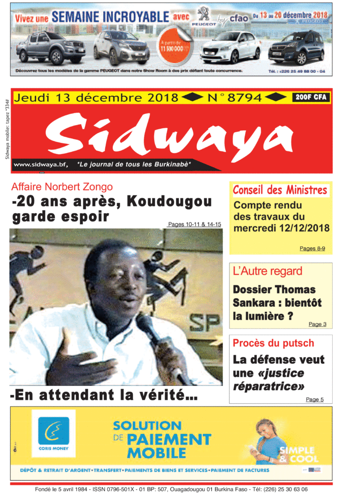 SIDWAYA QUOTIDIEN Sidwaya du 13 12 2018 Par BS. Sidwaya - 12 décembre 2018 FacebookTwitterPinterestWhatsAppLinkedinE-mailImprimerTumblrTelegramViberNaver