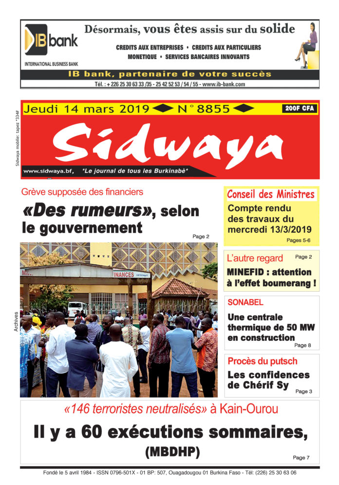 SIDWAYA QUOTIDIEN Une sidwaya du 14 03 2019 Par BM. Sidwaya - 14 mars 2019 FacebookTwitterPinterestWhatsAppLinkedinE-mailImprimerTumblrTelegramViberNaver
